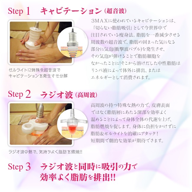 マシン名の由来は3つの施術機能を持ってるからです。なので3工程ございます。
